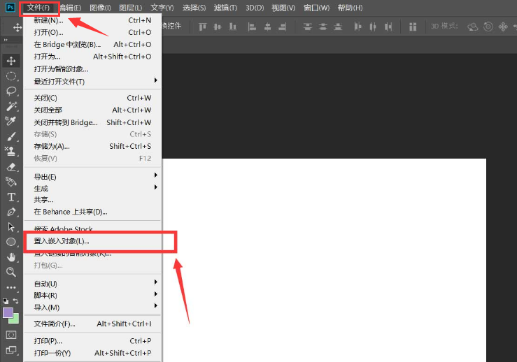 1.首先新建空白画布后,点击文件菜单下的置入嵌入对象按钮,导入图片素材;