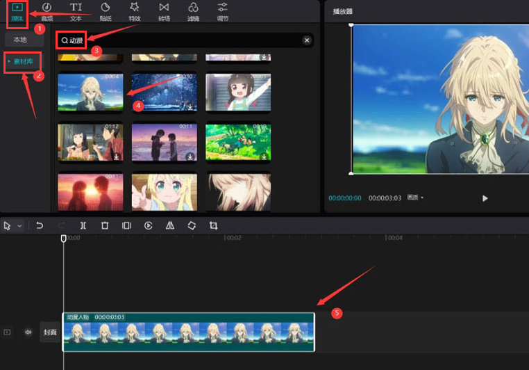 1.首先点击左上角媒体菜单中的素材库按钮,搜索动漫视频素材将其添加到视频轨道中