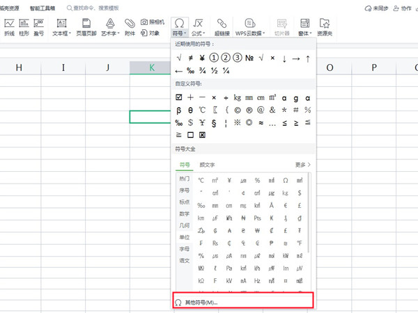 1、选择单元格,在“插入”页面点击【符号】旁边的小三角,选择【其他符号】。
