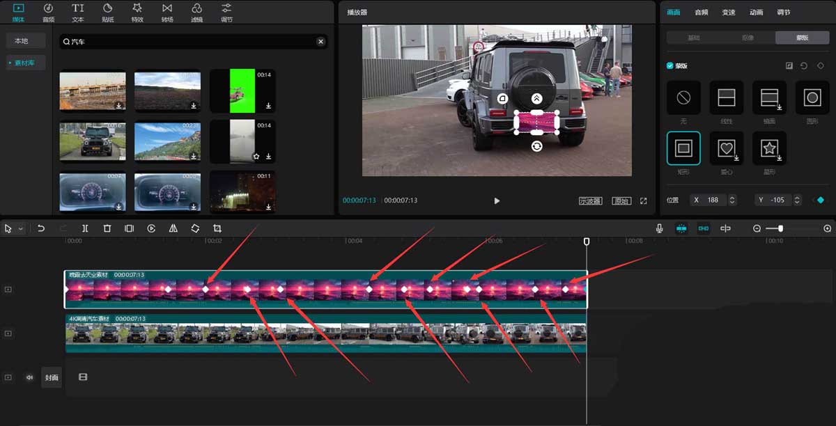 选中天空素材,点击右侧蒙版按钮,选择矩形蒙版,调整蒙版大小使其遮挡住汽车号牌,然后点击"添加关键帧"按钮。