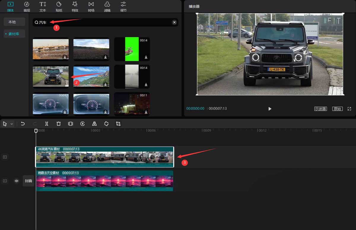 在搜索栏中再次输入汽车两字,添加一段带车牌的素材到视频轨道中,并调整两段素材时长一致。