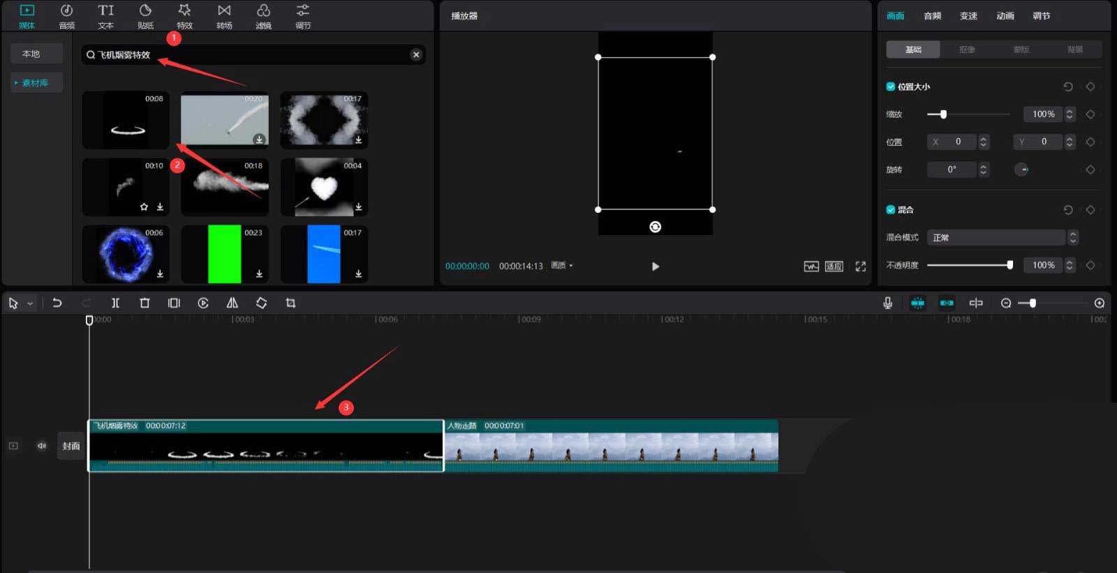 在搜索栏中输入飞机烟雾特效六个字,选择一段视频素材,将其添加到视频轨道中,见下图。