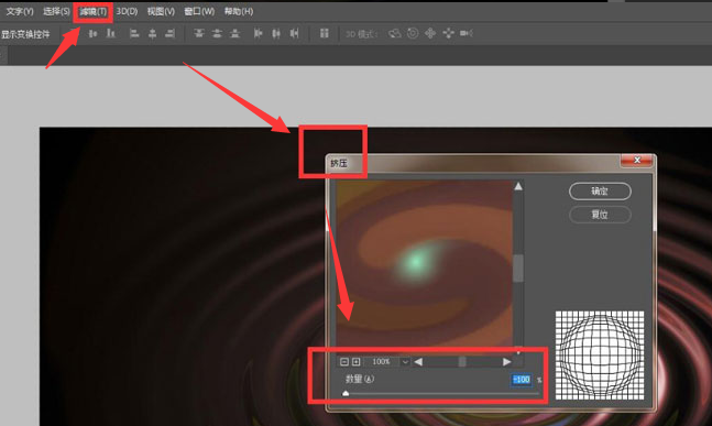 3.点击滤镜菜单中的扭曲选项,打开挤压设置窗口,将数量修改为-100