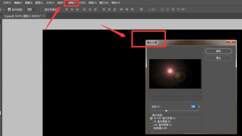 1.新建一个黑色填充的空白图层,找到滤镜菜单中的渲染栏目,点击镜头光晕按钮