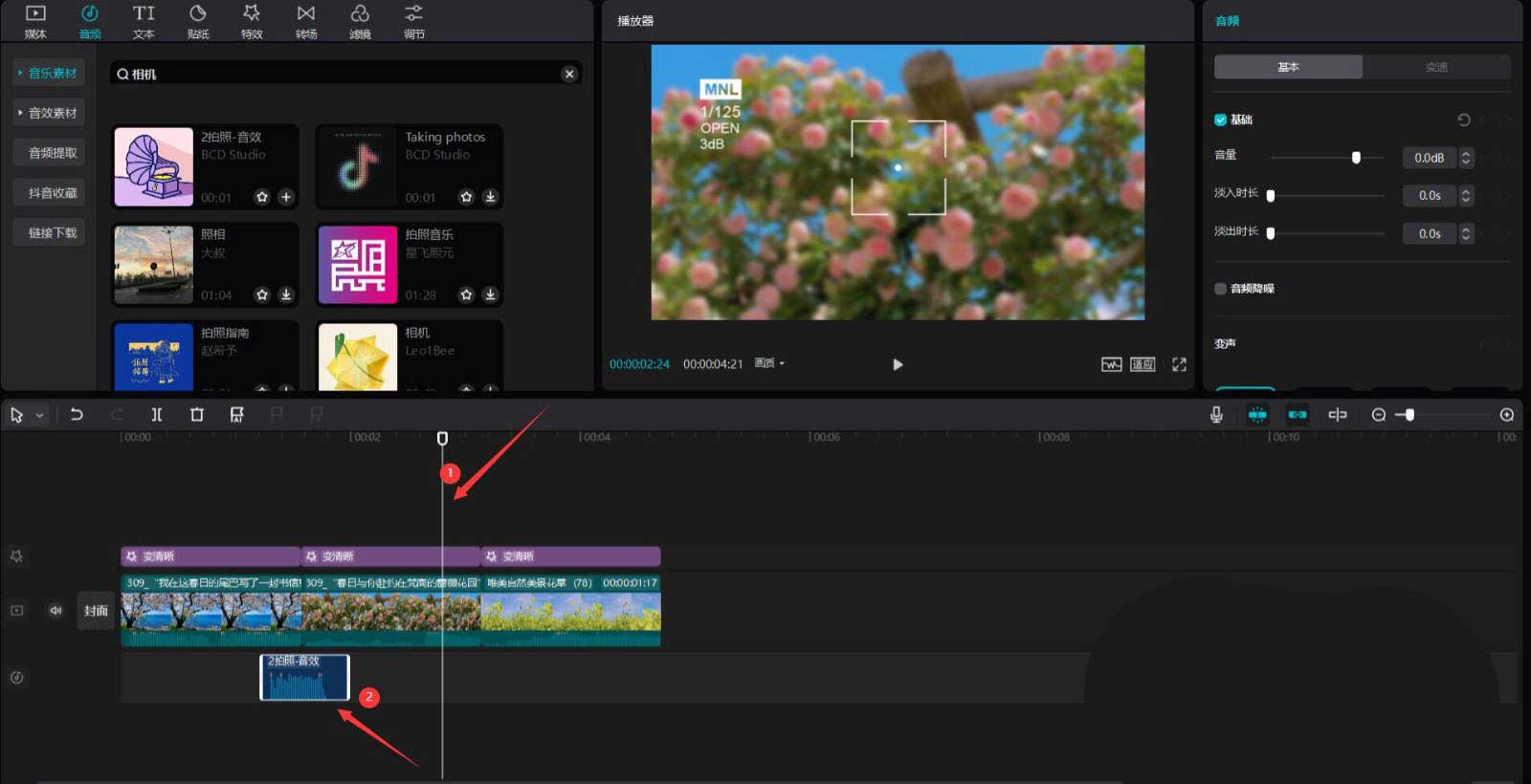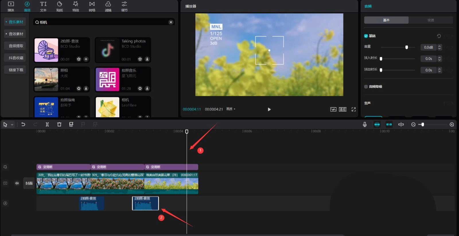 将时间轴移动到第一段春日素材五分之四处,点击音频按钮,在搜索栏中输入相机两字,选择一段音效素材,将其添加到音频轨道中,见下图。