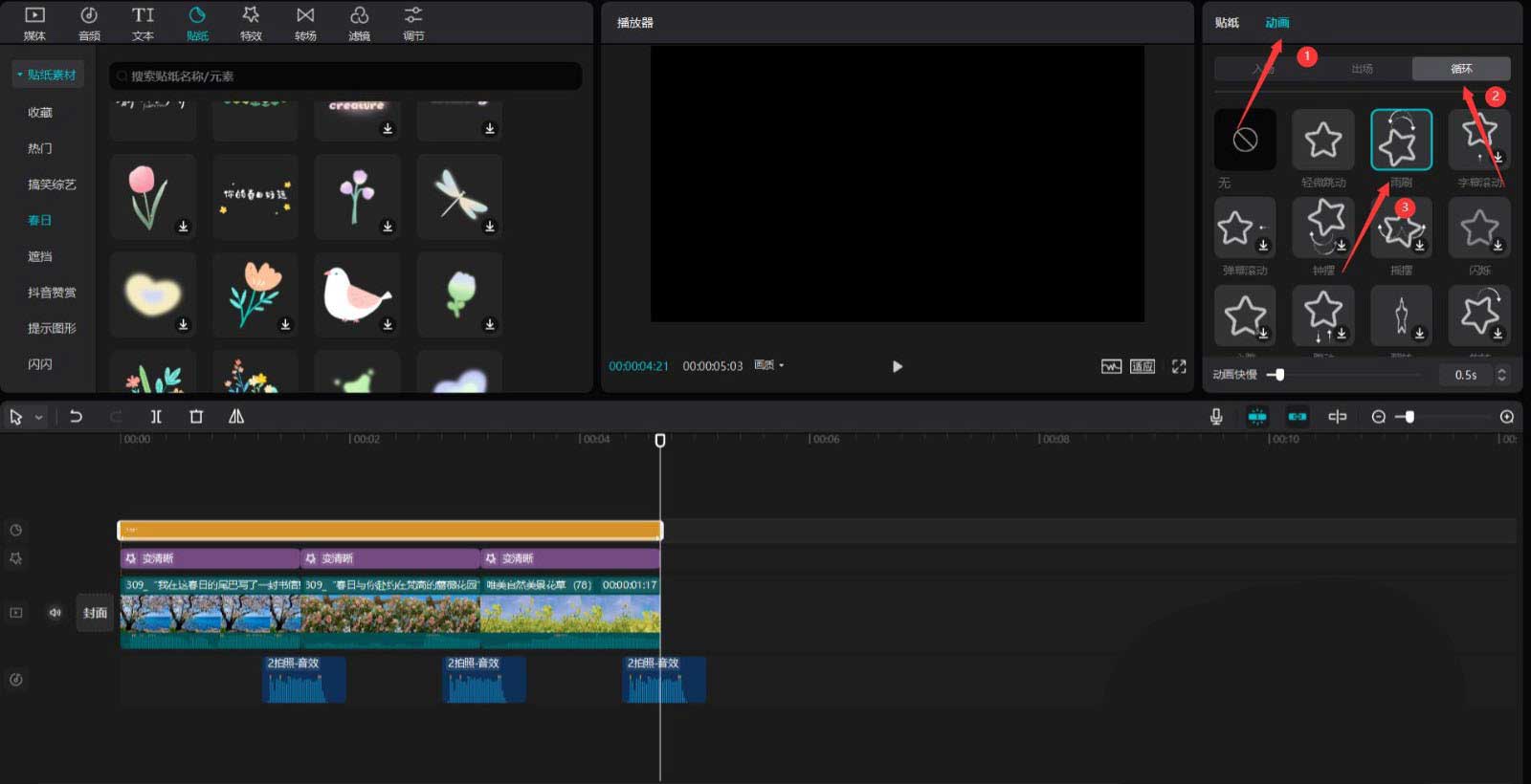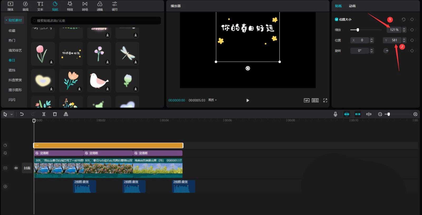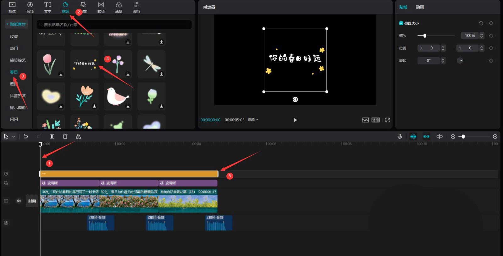 将时间轴移动到开始的位置,点击贴纸按钮,选择春日中的一张贴纸素材,将其添加到贴纸轨道中,然后调整贴纸素材的结尾和第三段春日素材的结尾对齐,见下图。