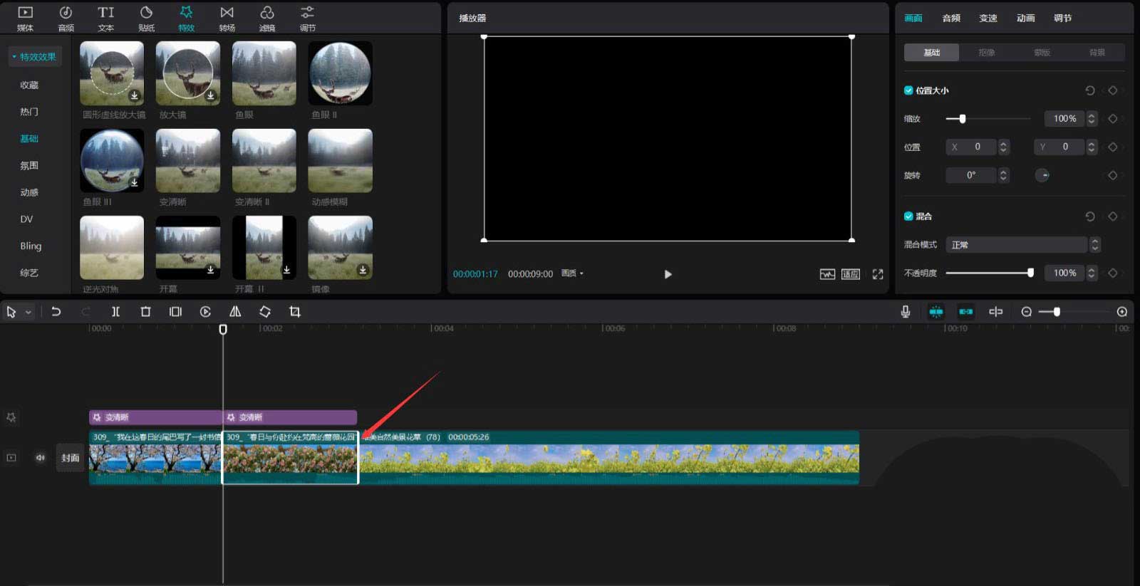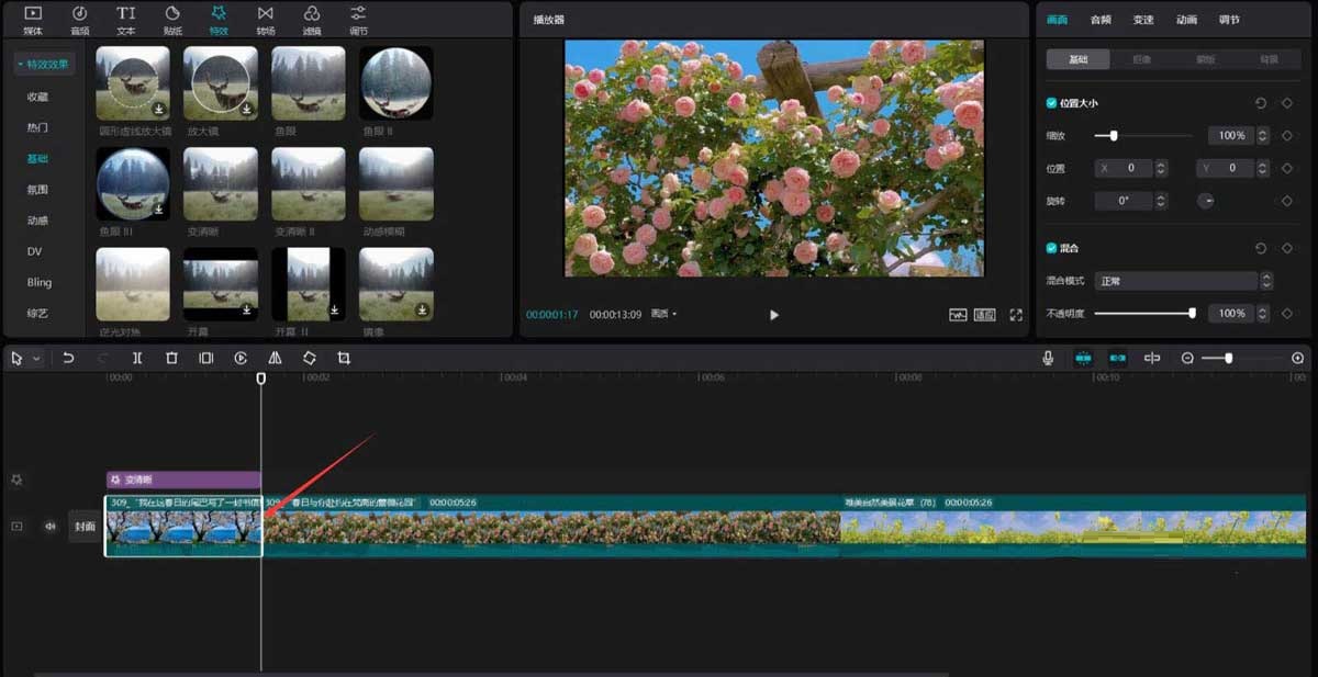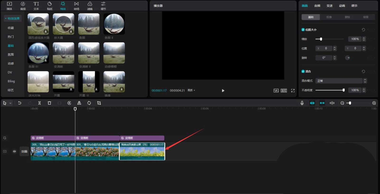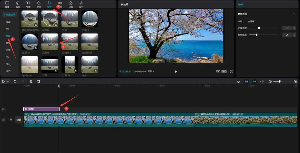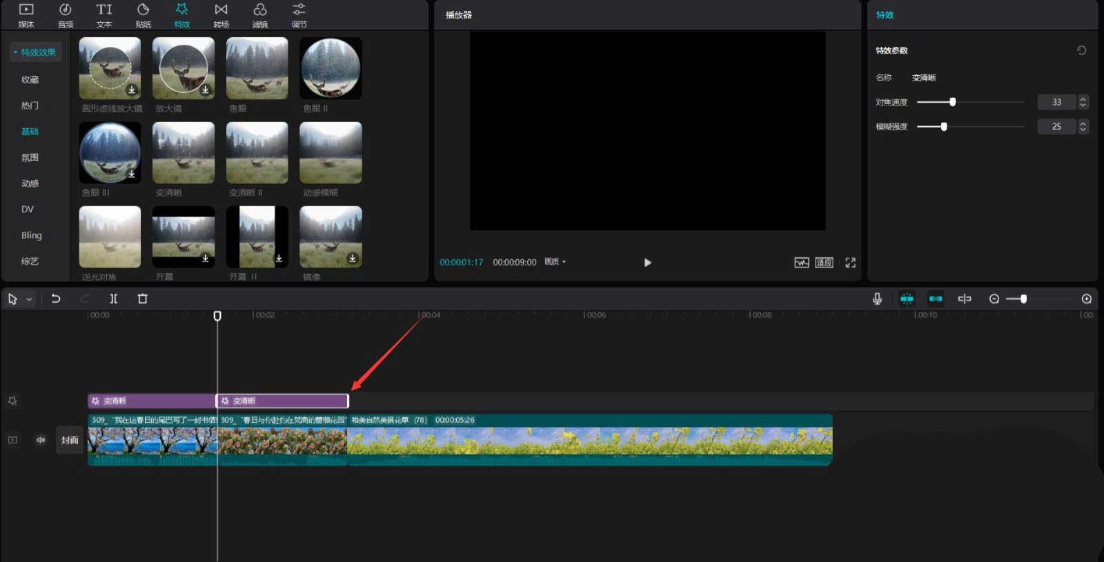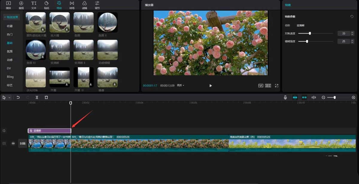 点击特效按钮,选择基础中的变清晰特效,将其添加到特效轨道中,然后调整特效时长为1.6秒,见下图。