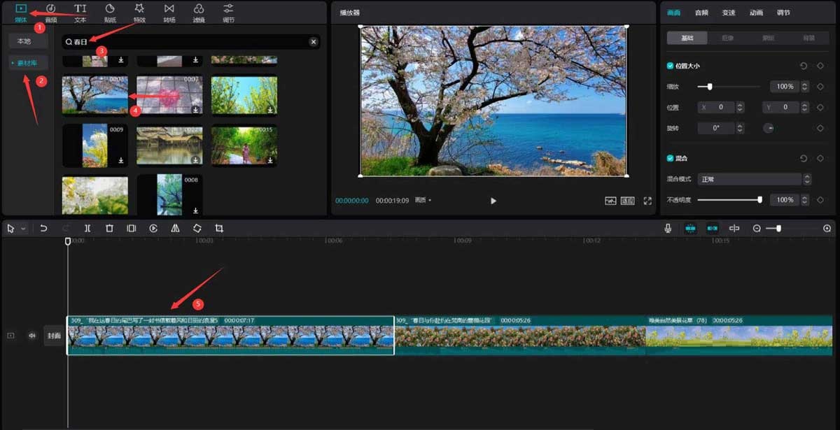 点击媒体按钮,然后点击素材库按钮,在搜索栏中输入春日两字,选择三段视频素材,将它们添加到视频轨道中,见下图。