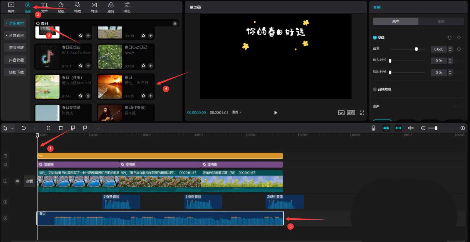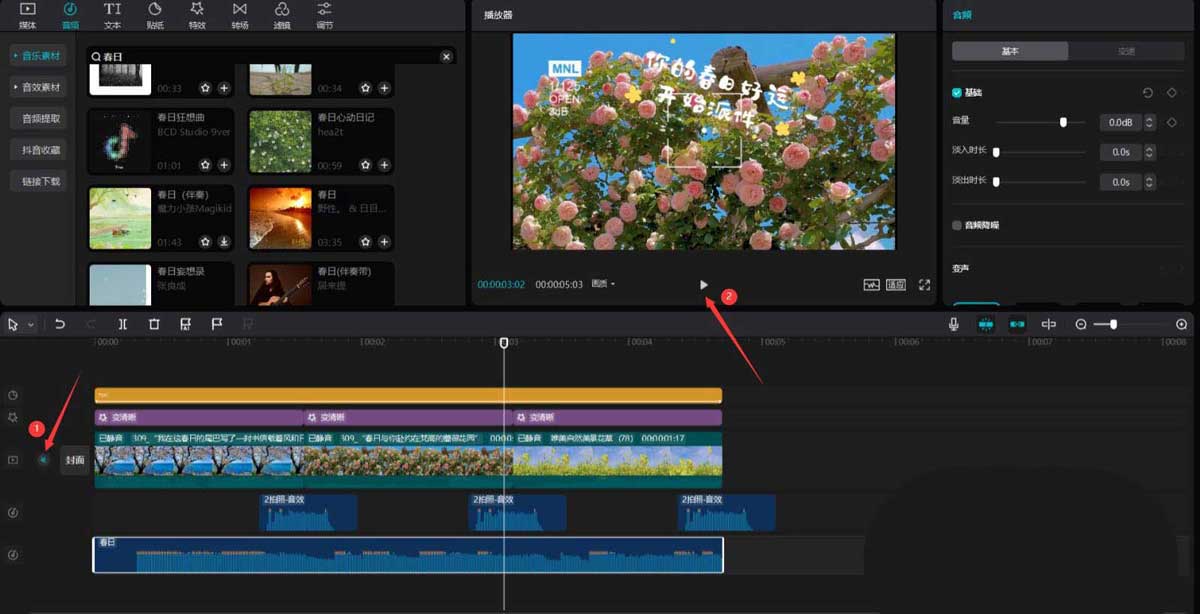 将时间轴移动到开始的位置,点击音频按钮,在搜索栏中输入春日两字,选择一段音频素材,将其添加到音频轨道中,然后调整音频素材的结尾和第三段春日素材的结尾对齐,见下图。