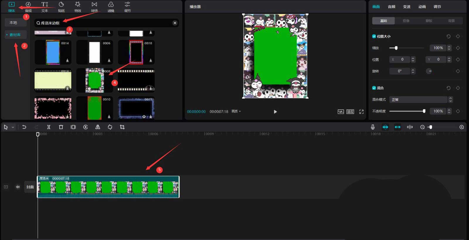 然后点击媒体按钮,点击素材库按钮,在搜索栏中输入库洛米边框五个字,选择一段视频素材,将其添加到视频轨道中。