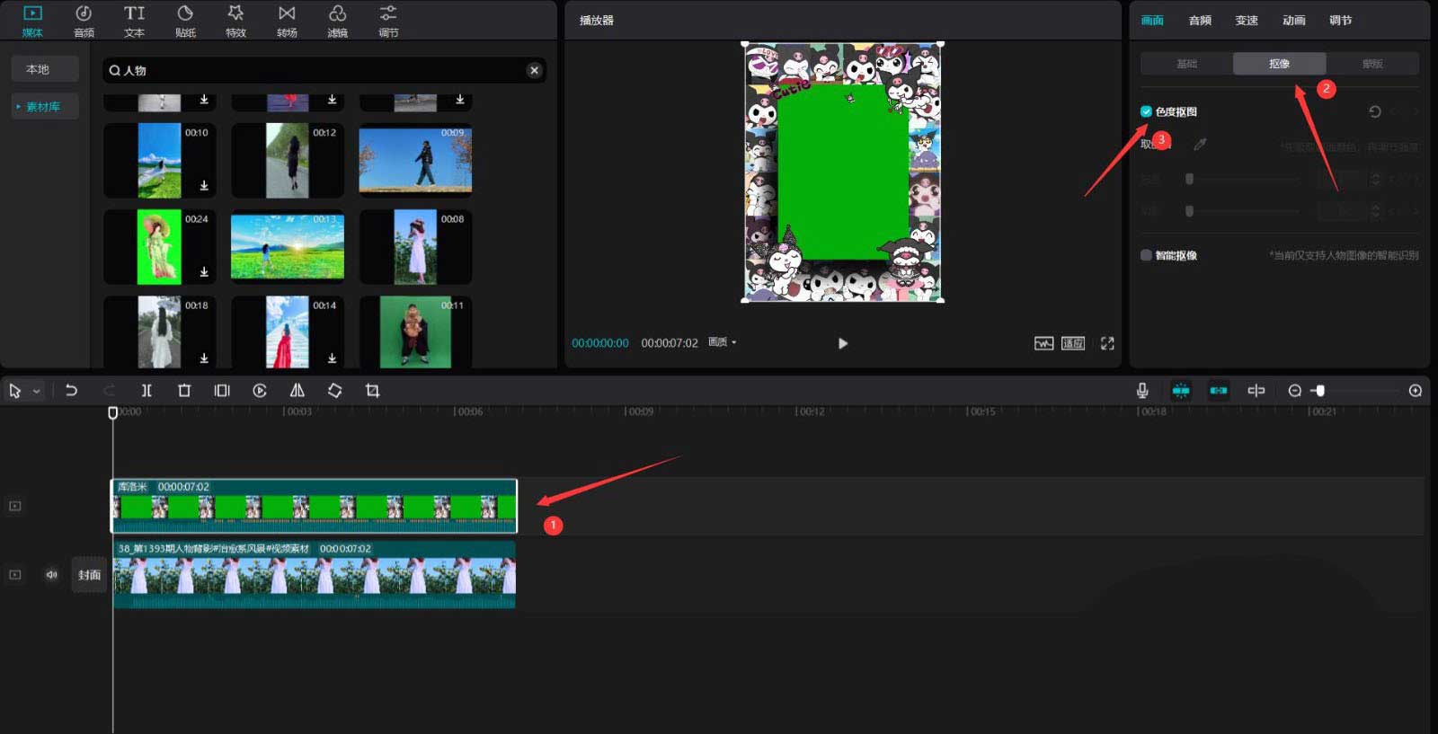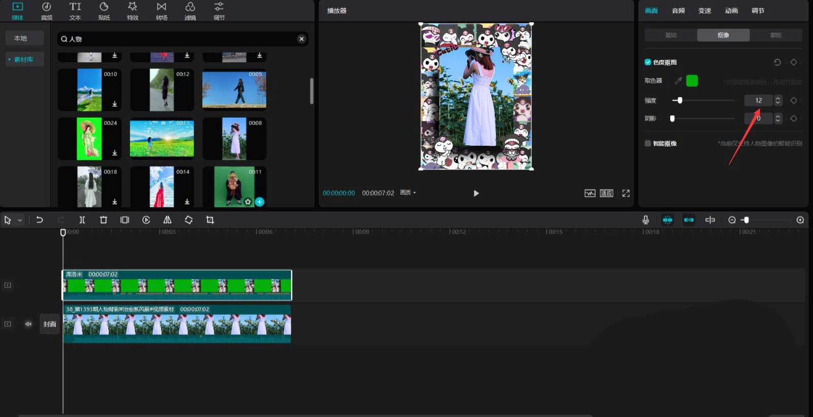 之后选中边框素材,点击抠像按钮,选择色度抠图。
