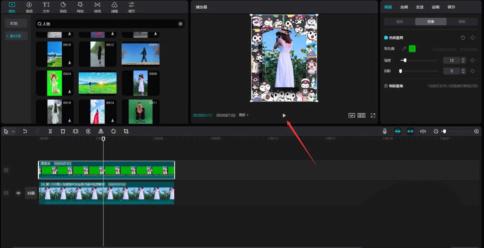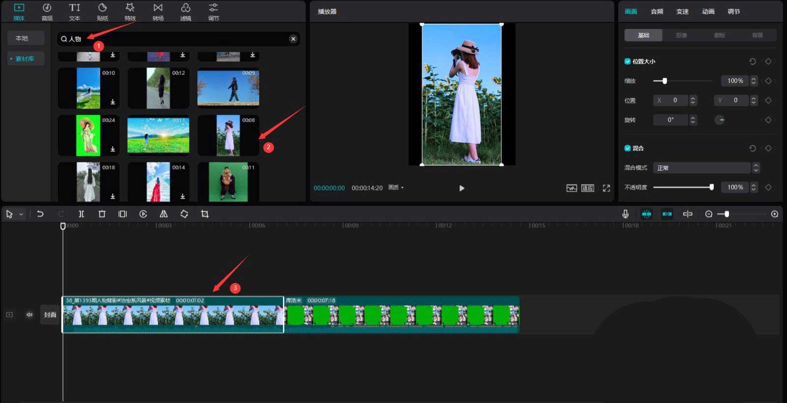 接着在搜索栏中输入人物两字,选择一段视频素材,将其添加到视频轨道中。
