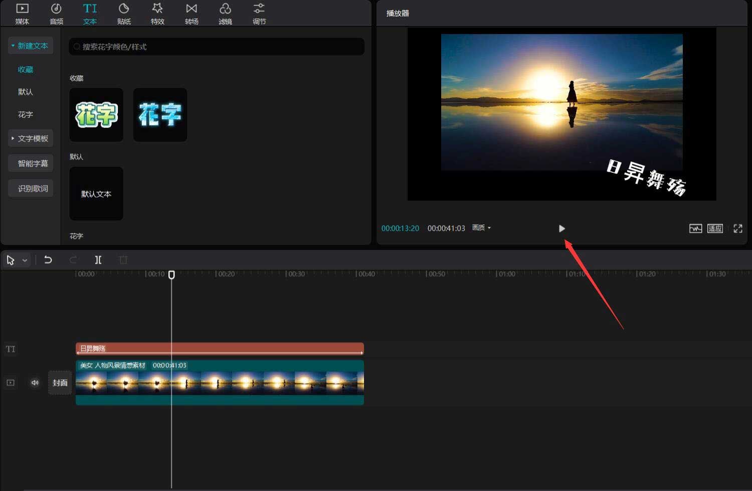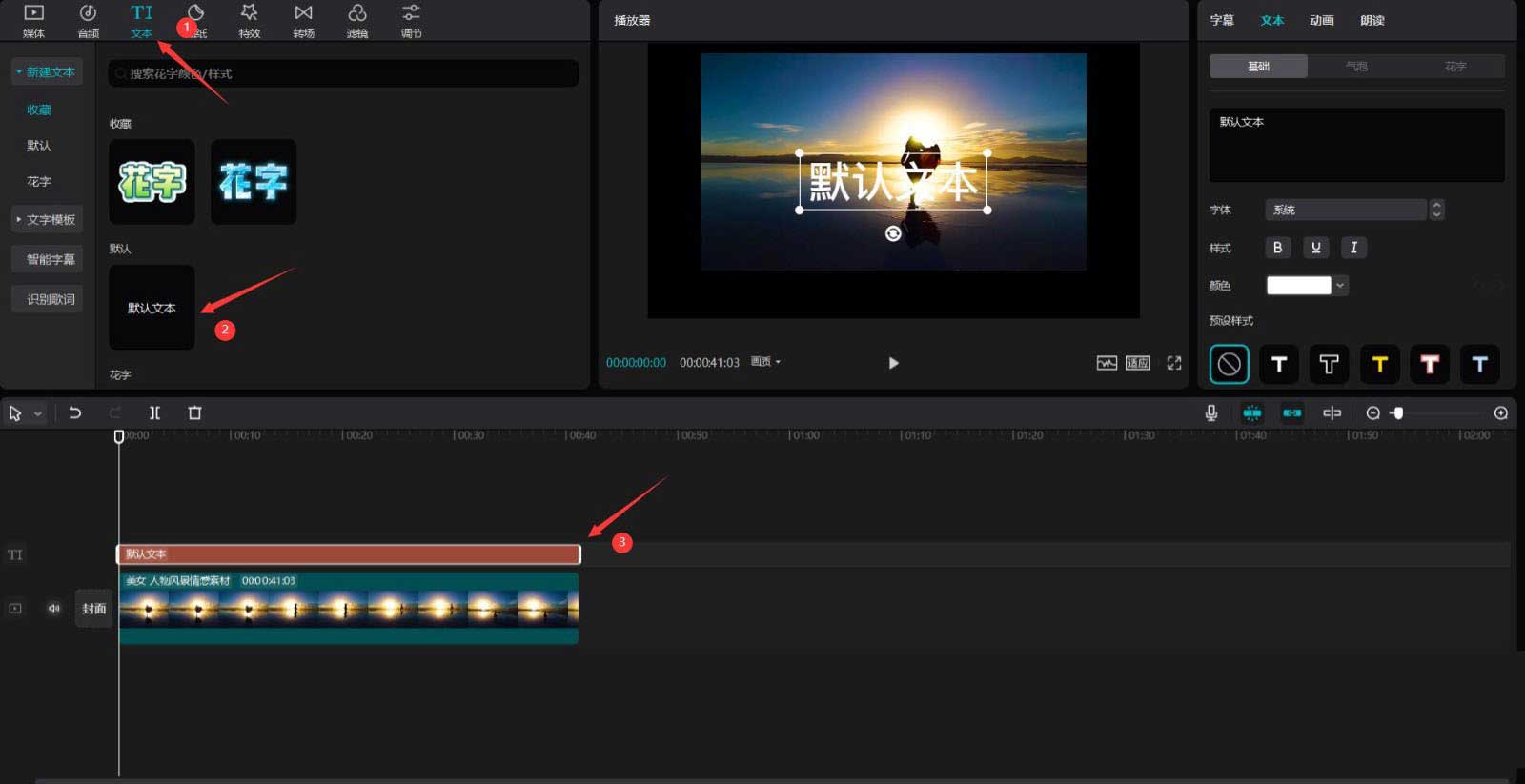 随后点击文本按钮,选择默认文本,将其添加到文本轨道中,调整文本的结尾和人物素材的结尾对齐。