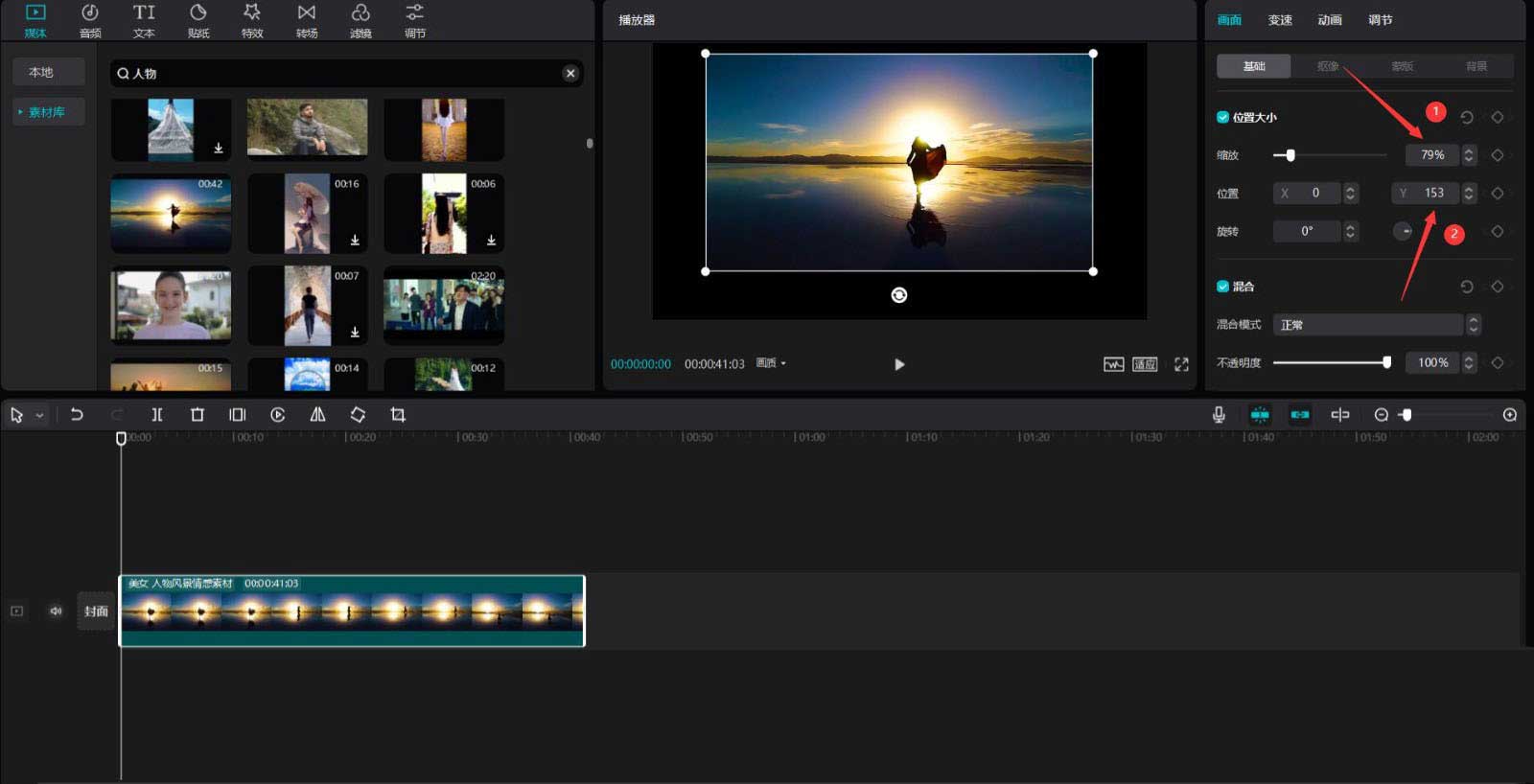 然后点击媒体按钮,点击素材库按钮,在搜索栏中输入人物两字,选择一段视频素材,将其添加到视频轨道中。