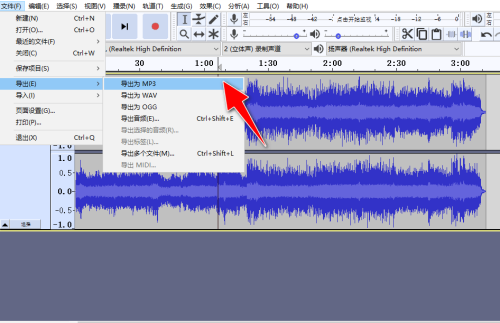 5、最后完成操作后,选择"文件"->"导出"->"导出为MP3",可将处理后的音频导出到本地电脑上。