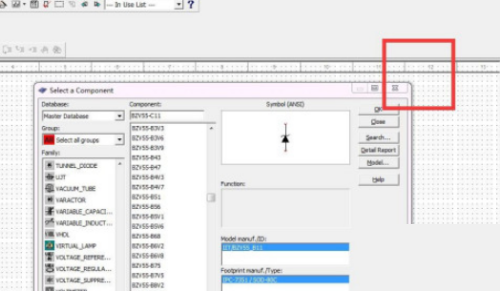 6、最后绘制完BZV55-C11二极管之后会重新弹出选择器件的窗口,如果我们需要放置新的元器件那就重复上述操作,如果绘制完BZV55-C11二极管后不需要别的器件了,那么我们只需要关闭这个窗口就可以了,如图: