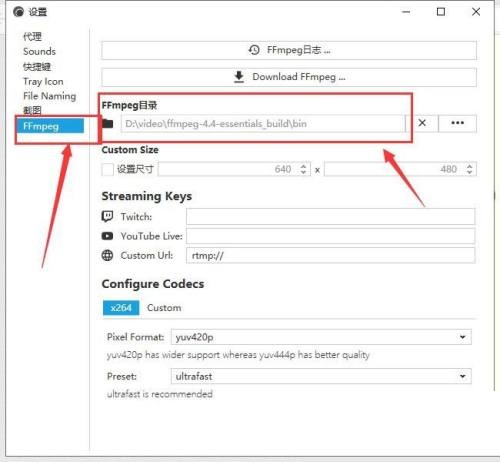 5、最后FFmpeg目录路径设置为刚刚下载文件里面的bin文件夹下,返回即可。
