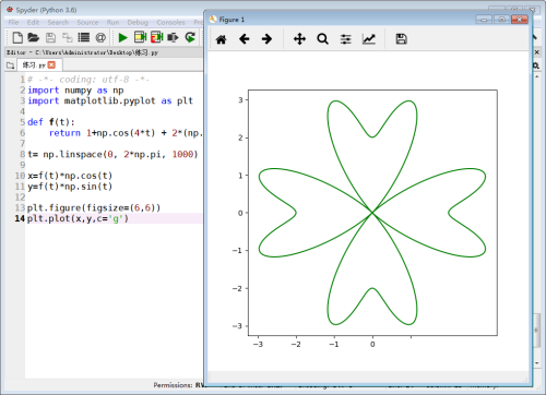 6、再绘制四叶玫瑰线:plt.plot(x,y,c="g")。