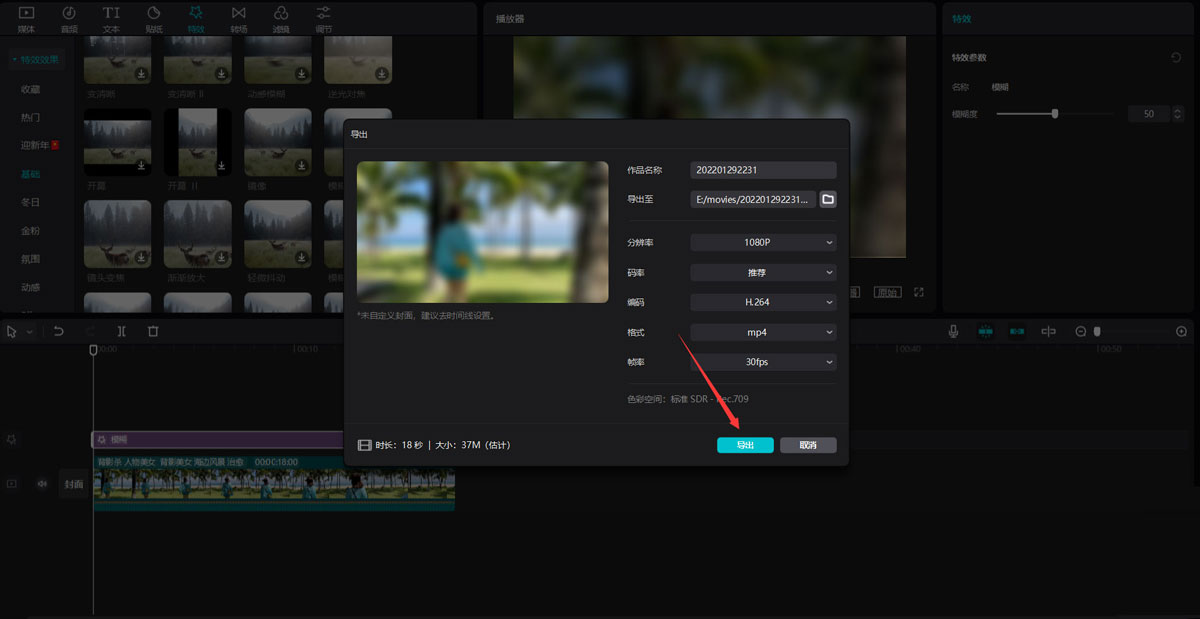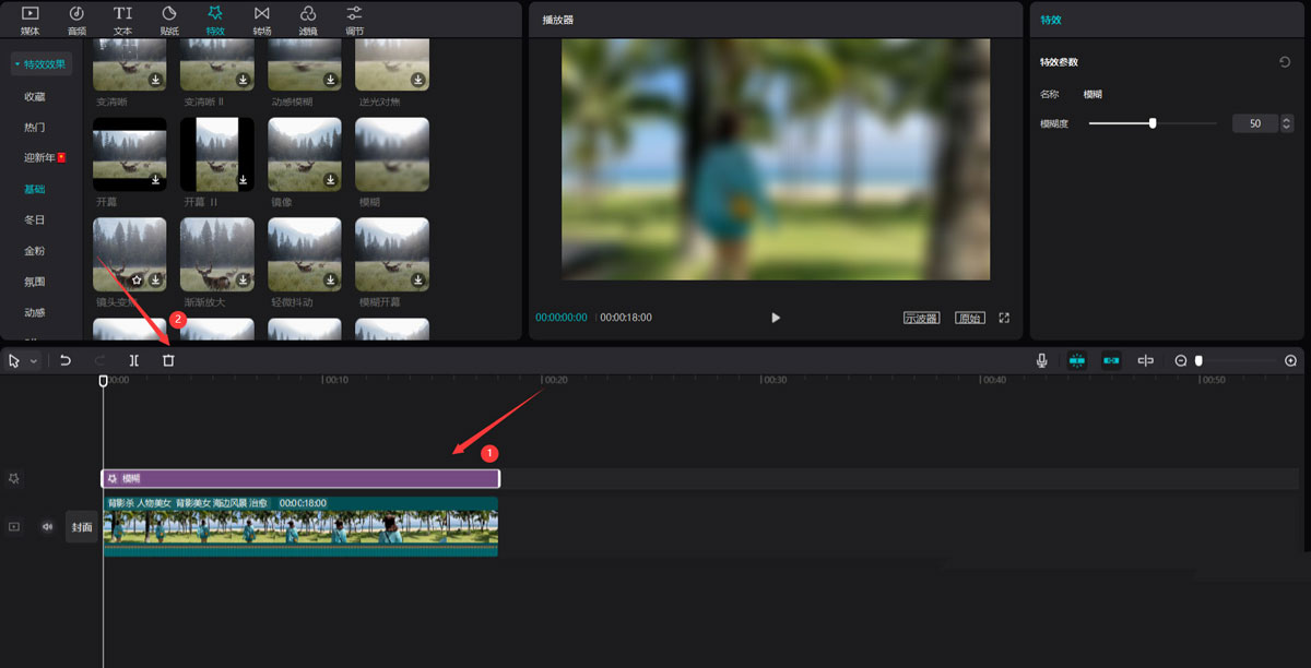 点击特效按钮,选择基础中的模糊特效,将其添加到特效轨道中,然后将特效时长调整为和视频一致。