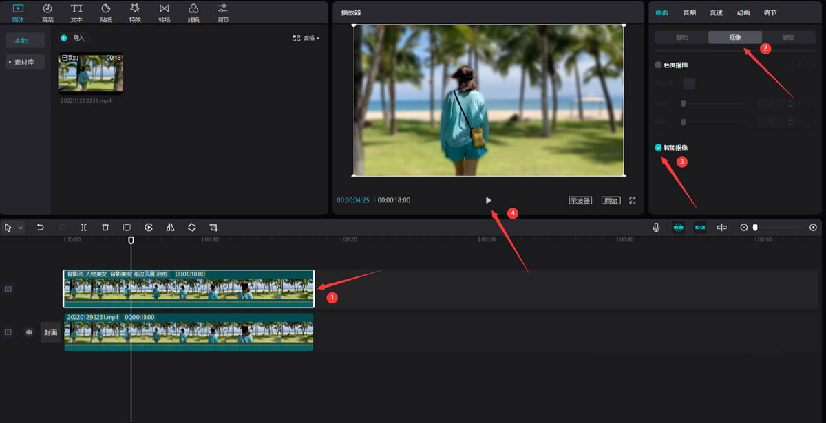 选中原始视频素材,点击右侧的抠像按钮,选择智能抠像,然后点击播放按钮就能看到效果了。