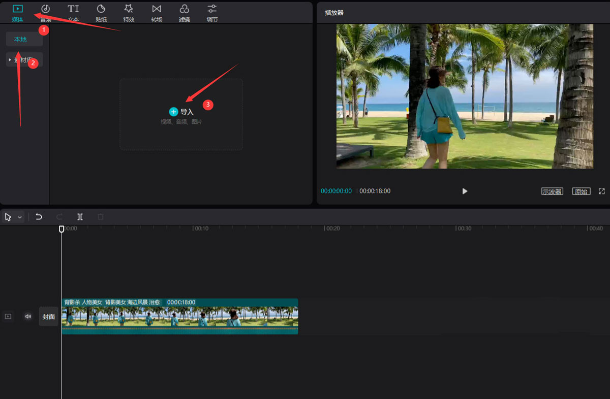 点击媒体按钮,然后点击素材库按钮,在搜索栏中输入人物两字,选择一段背景不模糊并且带有人像的视频素材,将其添加到视频轨道中。