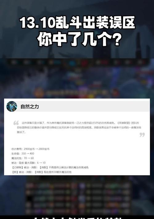 在《英雄联盟》中,乱斗先锋是一种极具刺激和快节奏的游戏模式,每次玩家都可以选择不同的英雄进行战斗。然而,对于乱斗先锋的出装策略,许多玩家常常感到困惑。本文将为大家提供一些关于乱斗先锋出装的攻略和建议,帮助玩家们在游戏中取得更好的战绩。